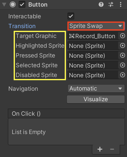 | Sprite Swap | 현재 버튼 상태에 따라 서로 다른 스프라이트를 표시할 수 있고, 스프라이트를 커스터마이즈할 수도 있음 |
