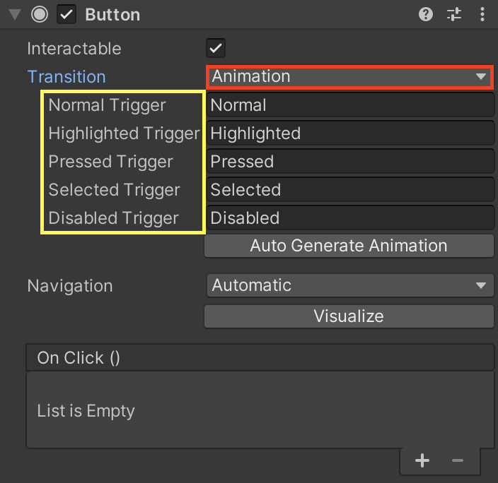 | Animation | - 버튼 상태에 따라 애니메이션이 실행되도록 함 - 애니메이터 컴포넌트가 있어야만 애니메이션 전환을 사용할 수 있음 - 루트 모션이 비활성화되어 있는지 확인해야 함 - 애니메이션 컨트롤러를 생성하려면, 애니메이션 생성을 클릭하거나 스스로 애니메이션을 생성한 후, 버튼 애니메이터 컴포넌트에 애니메이션 컨트롤러를 추가해야 함 |
