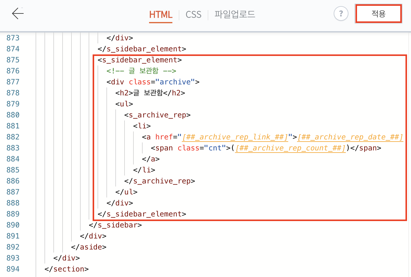 3. HTML에 있는 <s_sidebar> </s_sidebar> 사이 원하는 위치에 다음 코드를 넣어준다.