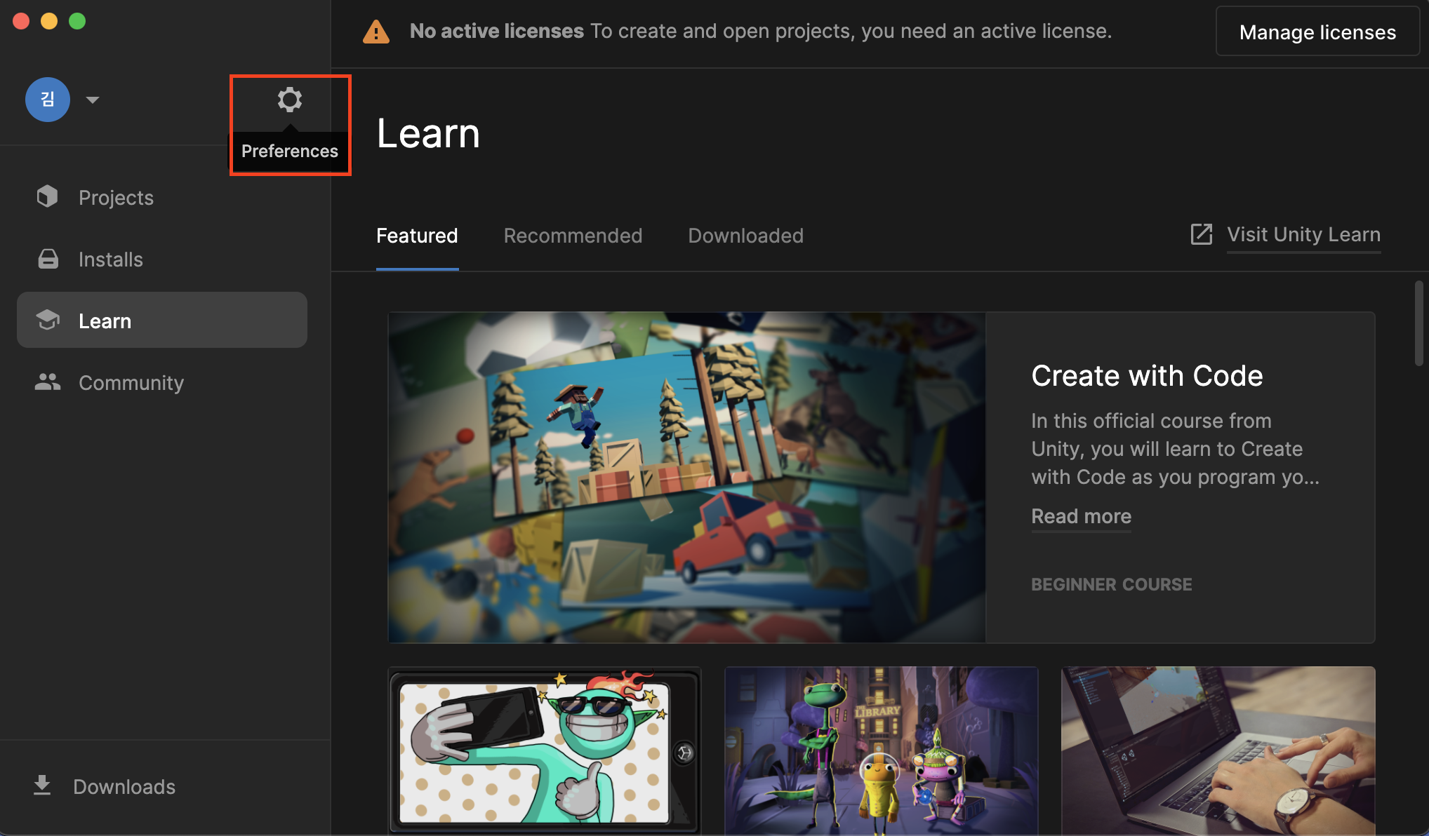 Unity를 오랜만에 들어와서 licenses를 다시 설정해야 한다.