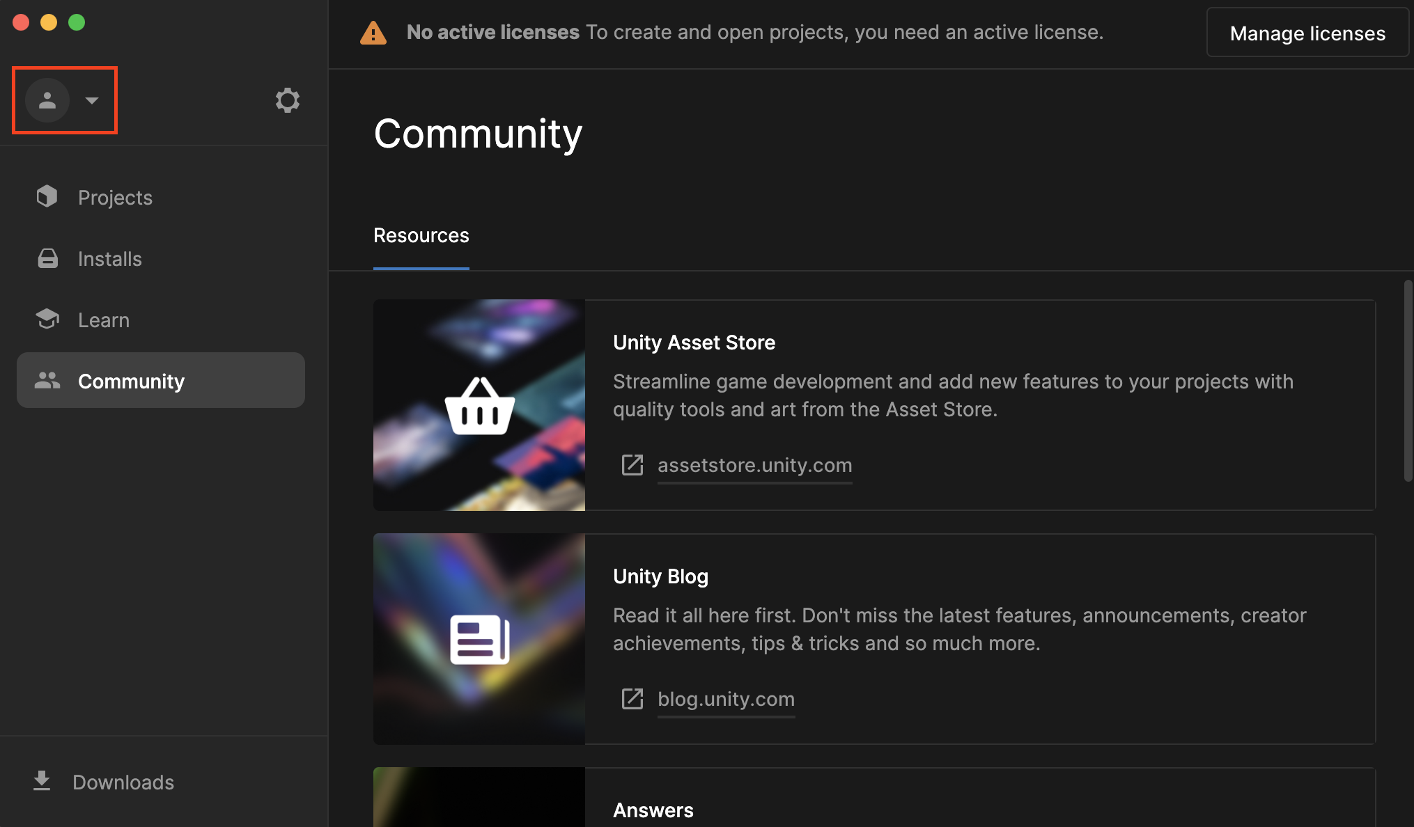 1. Unity Hub 실행 후 프로필 아이콘을 누른다.
