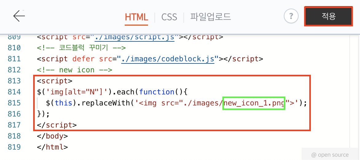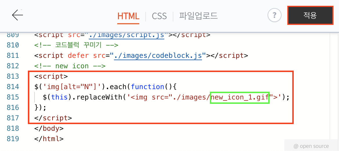 HTML 스크립트 파일명.확장자명을 파일업로드에 새로 추가한 new icon 이미지에 맞게 바꿔주면