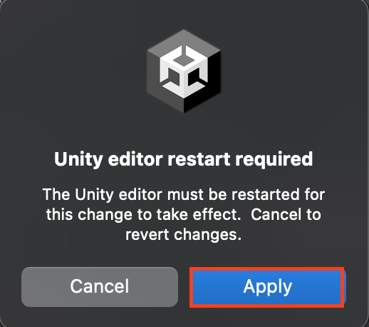 6. Apply 클릭 -> Unity 창이 잠깐 닫혔다가 다시 열릴것이다.