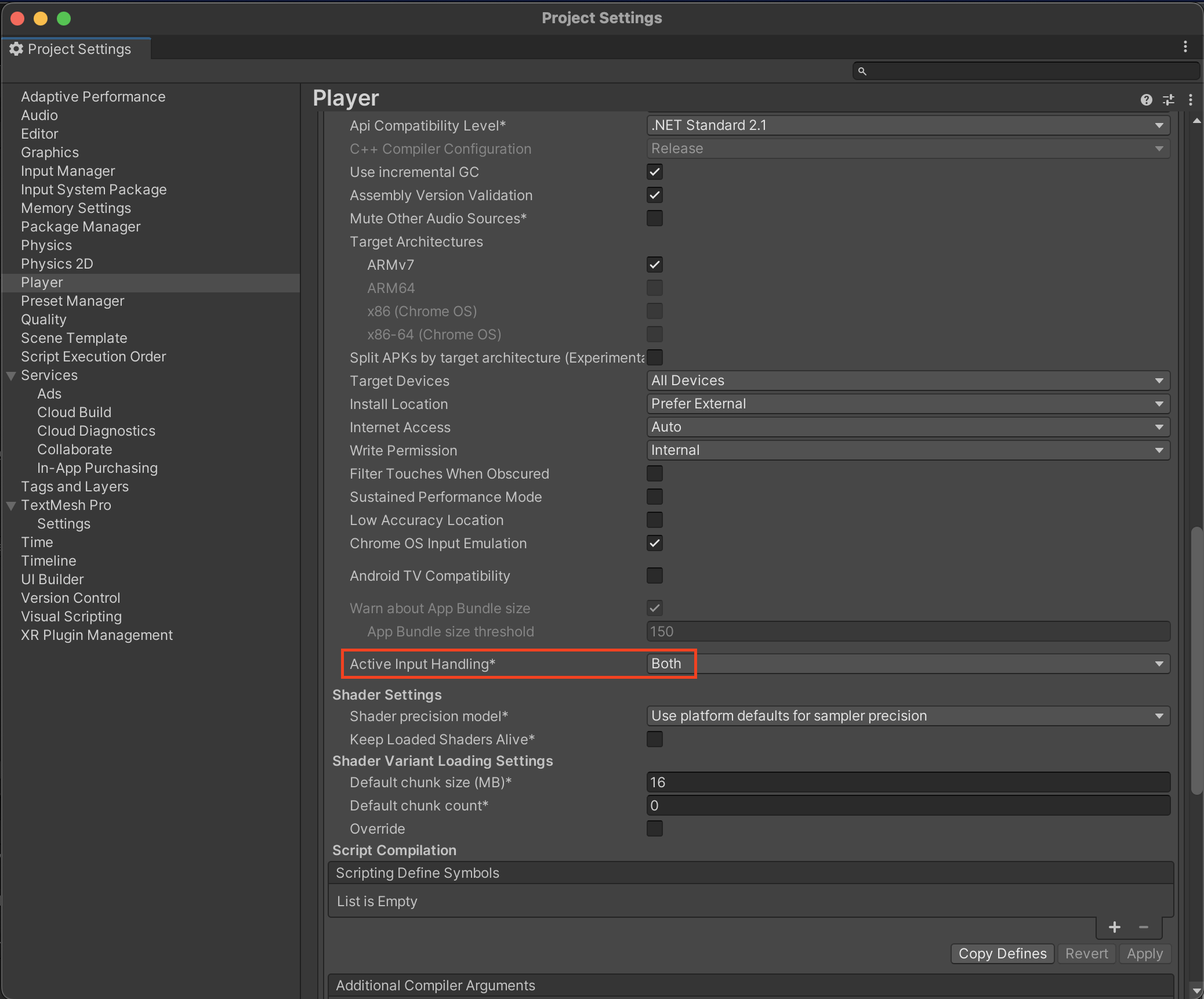 4. Active Input Handling* 이 Input System Package (New)로 되어있을 것이다. (아니면 말고)