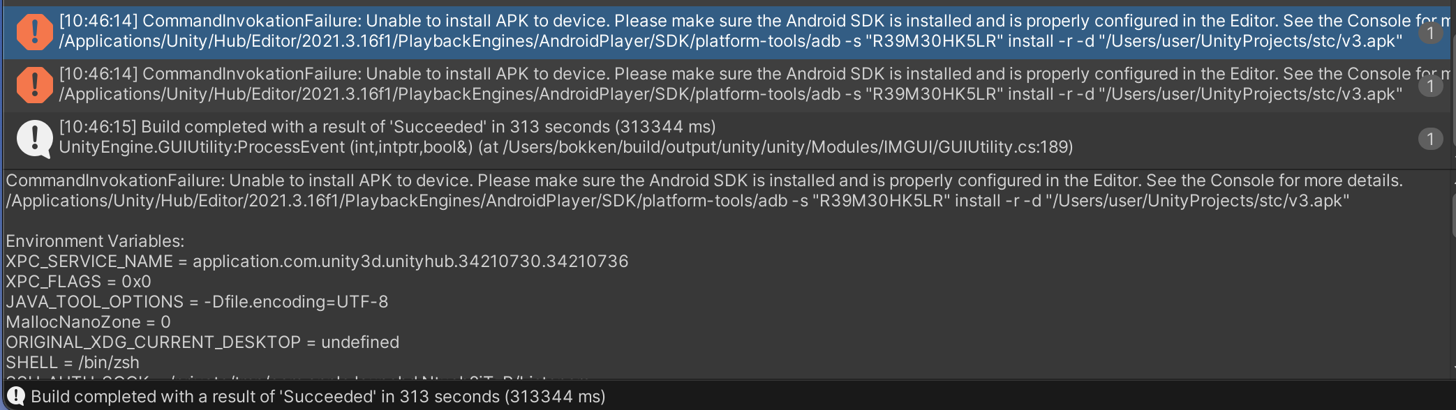 CommandInvokationFailure: Unable to install APK to device. Please make sure the Android SDK is installed and is properly configured in the Editor. See the Console for more details.