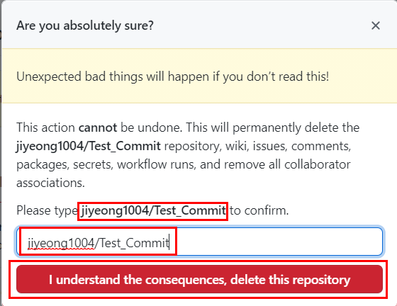똑같이 잘 써줬으면 I understand the consequences, delete this repository 버튼을 누를 수 있게 된다.