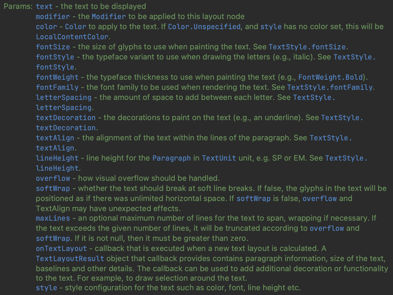 - onTextLayout : softWrap 등으로 인해 text의 크기 측정이 달라졌을 때의 Callback